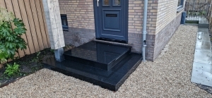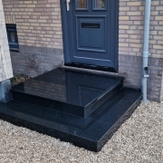 Nero Provondo is een natuursteen met een intense donkere kleur en subtiele nuances. Het straalt klasse en rust uit – precies wat je wilt voor een uitnodigende entree. De stoepplaat die we hebben mogen maken, vormt een krachtig visueel element bij binnenkomst en geeft het pand direct een luxe uitstraling.